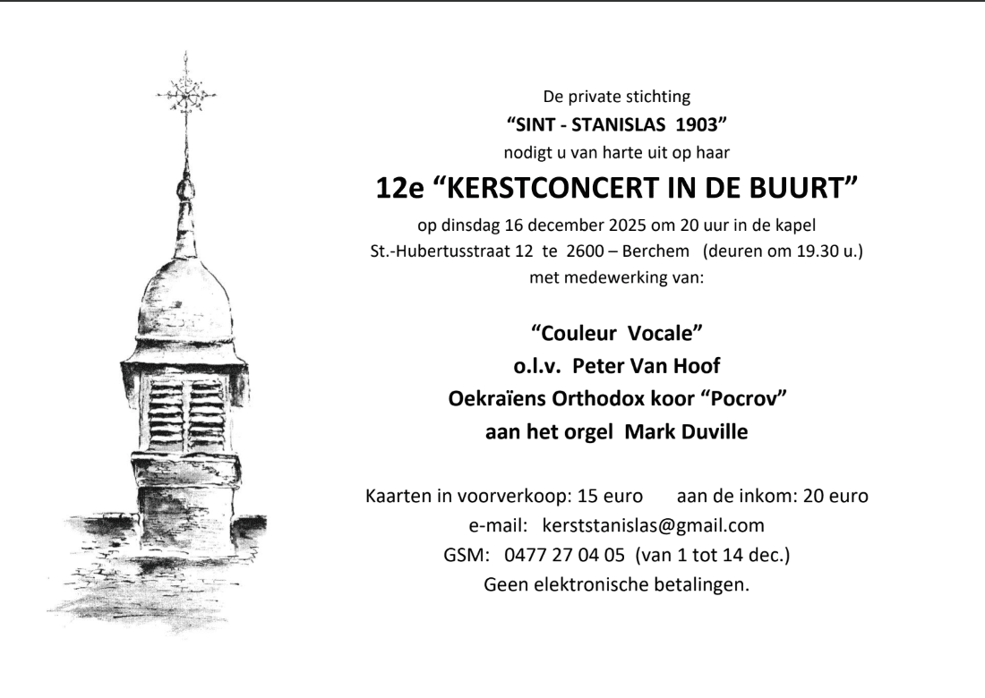 Op dinsdag 16 december is Couleur Vocale te gast op het “Kerstconcert in de buurt” in de Stanislaskapel in Berchem. Dit evenement wordt georganiseerd door de vereniging “Stanislas 1903”.